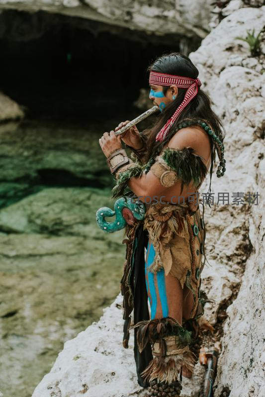 一名身着部落传统服饰、面部彩绘的男子站在岩石边吹奏骨笛,身旁是幽深洞穴,整体氛围神秘古老,充满仪式感。