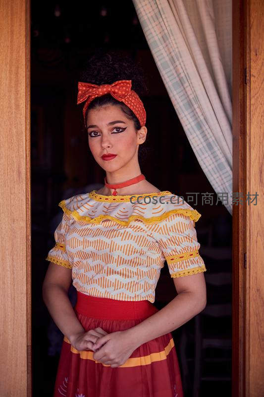 一位身着复古波点上衣与红色长裙的女子,头戴蝴蝶结发带,站在木质门框内,眼神专注而温柔,背景窗帘轻垂,营造出怀旧而宁静的氛围。