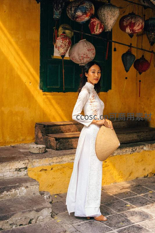 一位身着白色刺绣奥黛的女子,手提斗笠,伫立在阳光洒落的黄色古墙前,背景悬挂着色彩斑斓的传统灯笼,尽显越南古典风情与宁静之美。