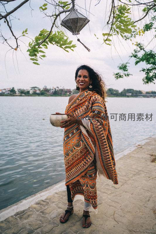 湖畔微笑女子身披异域花纹纱丽