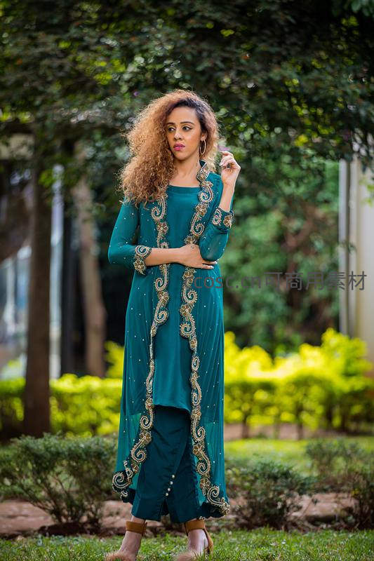绿意盎然中身着宝蓝刺绣长袍的佳人