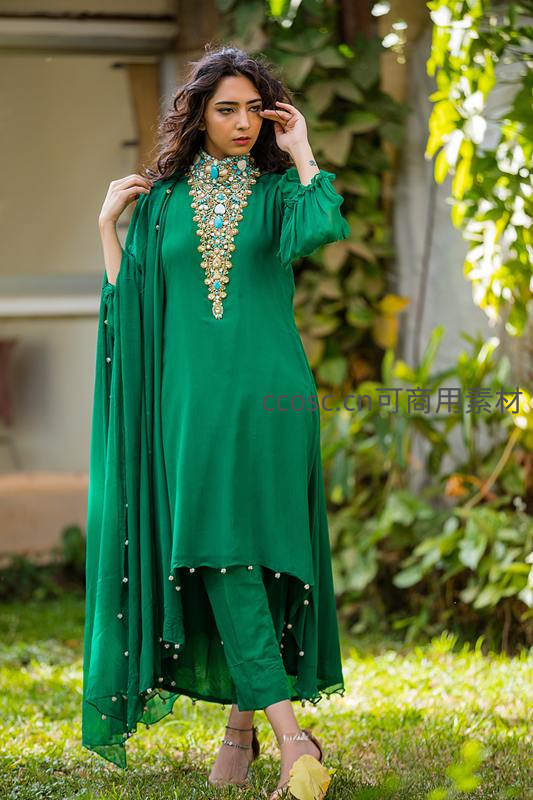 一位深色卷发女子身着墨绿色长裙,搭配镶嵌蓝宝石的华丽项链和同色系薄纱披肩,在阳光斑驳的花园中摆出优雅姿态,展现了南亚传统服饰的精致与华美。