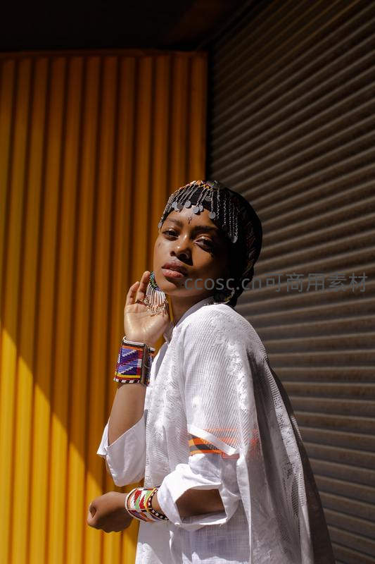 一位身着白色民族风服饰的女子,佩戴精致头饰与手镯,在明暗对比的墙面背景下侧身凝视,展现浓郁的文化韵味与时尚美感。