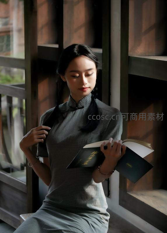 旗袍女子窗边静读时光