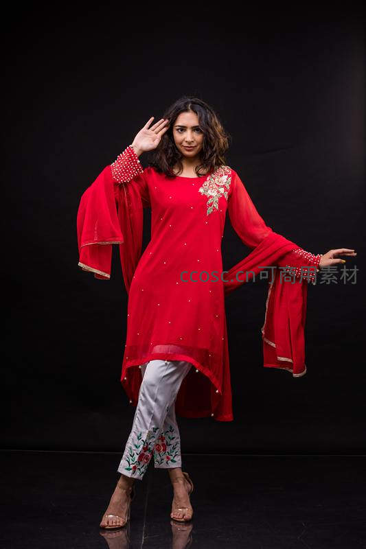 身着鲜艳红色长裙的女子在纯黑背景下摆出优雅姿势,衣袖飘逸,妆容精致,展现出浓郁的东方美学与现代时尚融合的独特魅力。