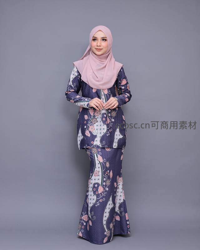 一位身着深紫色花卉图案长裙、佩戴淡粉色头巾的女性,姿态端庄,背景简洁,突显服饰细节与文化韵味。