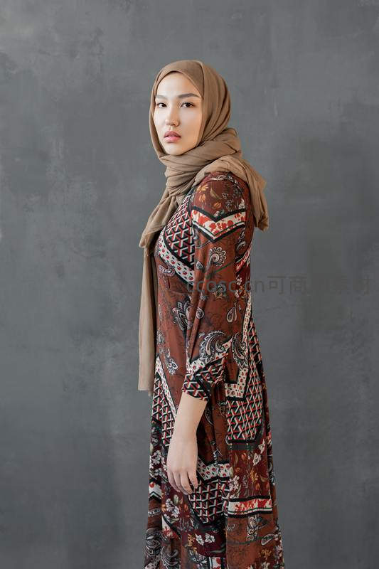 女子侧身站立,头戴浅棕色头巾,身穿红棕几何图案长裙,姿态优雅,目光回望镜头,尽显东方女性的温婉与自信。