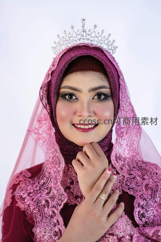 粉紫蕾丝头纱新娘戴皇冠微笑凝视