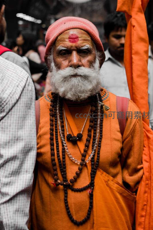 印度圣者额点朱砂穿橙袍挂念珠街头