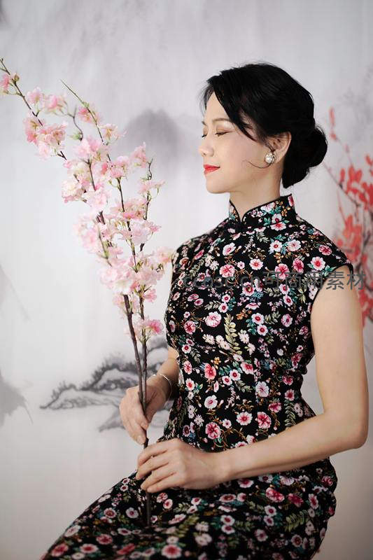 一位身着黑底花卉旗袍的女子,手持粉色樱花枝,在水墨背景前闭目浅笑,尽显东方女性的温婉与宁静。