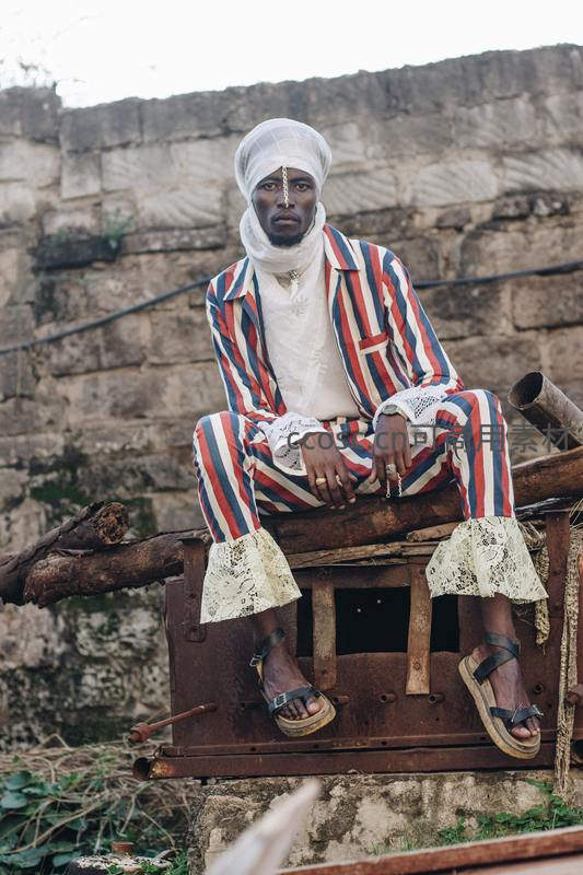 一位身着红蓝白条纹套装、头裹白巾的男子坐在锈迹斑斑的旧机器上,背景是古老的石墙,彰显独特街头时尚风格。