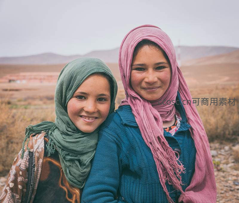 沙漠边缘两位戴头巾女孩的纯真笑容