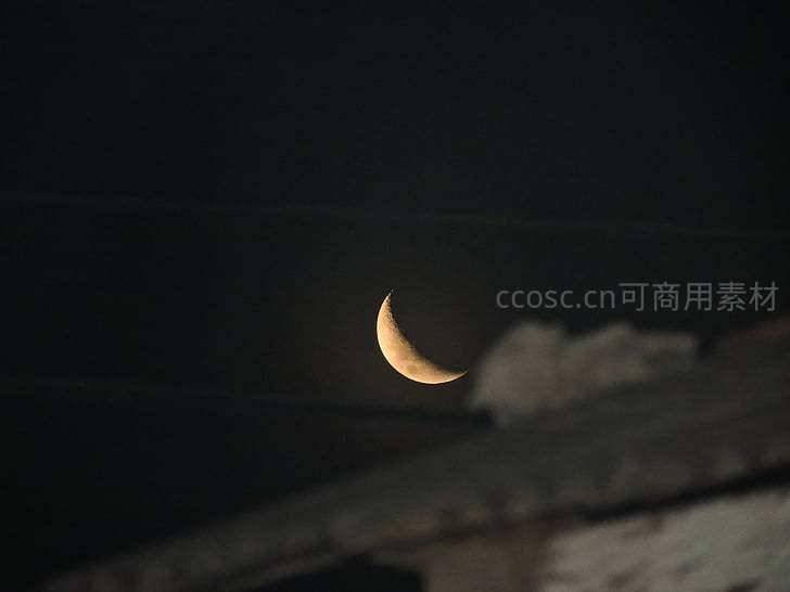 新月如钩挂天边,屋顶剪影添诗意