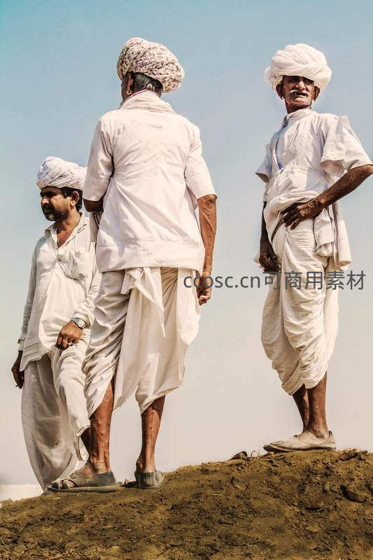 三位身着白色传统服饰、头戴头巾的印度男子站在土丘上,背对镜头或侧身而立,姿态自然,背景是晴朗天空,充满地域风情。