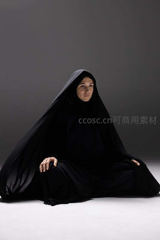 一位身披全黑长袍的女子盘腿静坐于纯色背景前,眼神平静直视镜头,整体画面极简却充满张力,传递出沉静与神秘感。