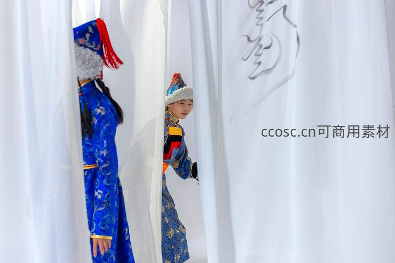 两个身着鲜艳民族服饰的孩子从白色纱帘后探出头来,一个好奇张望,一个含笑回眸,充满童真与民族文化交融的温馨画面。