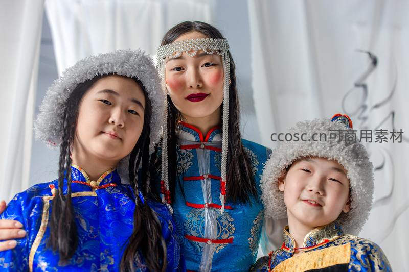 一位成年女性与两名孩童身着传统蒙古服饰亲密合影,头戴毛绒帽子,面带笑容,展现民族服饰之美与家庭亲情的温暖传承。