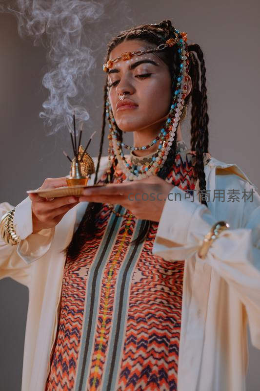 女子手持香炉,烟雾袅袅,身着多彩民族服饰,神情宁静专注,营造出充满仪式感与灵性的氛围。