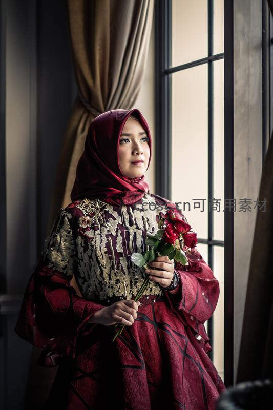 一位佩戴深红色头巾的穆斯林女子静立窗前,手中轻握一束红玫瑰,目光望向远方,姿态优雅,氛围宁静而充满诗意。