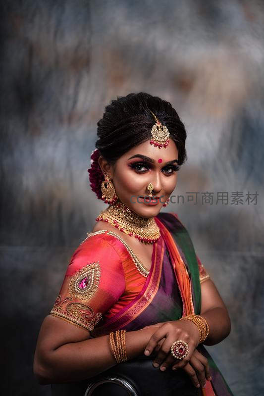 身着鲜艳纱丽的新娘佩戴繁复金饰与宝石,妆容精致,展现浓郁的印度传统婚俗之美与女性优雅气质。