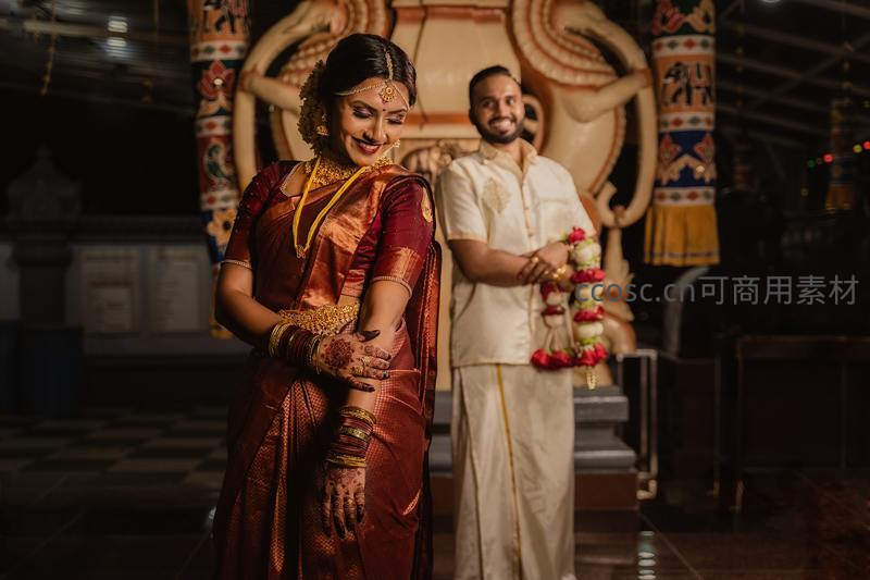 新郎新娘身着传统礼服于神庙内微笑合影,背景雕饰精美,花环点缀,传递神圣仪式感与甜蜜喜悦。