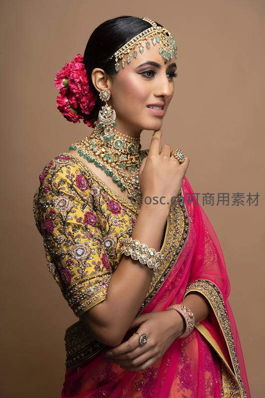 身着金黄刺绣与粉红纱丽的印度新娘,佩戴繁复绿宝石首饰,发间点缀红花,展现浓郁异域风情与庆典之美。