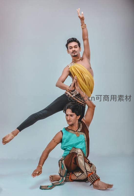 两位舞者身着传统服饰,以高难度托举动作展现古典舞蹈的力与美,背景简洁突出人物动态与服饰细节。