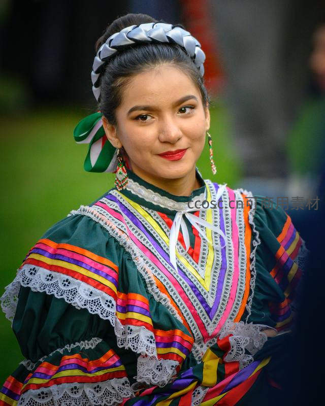一位年轻女子身着色彩斑斓、细节精致的传统民族服饰,头戴编织发带,面带温婉笑容,背景为模糊绿意,展现了浓郁的文化风情与青春活力。