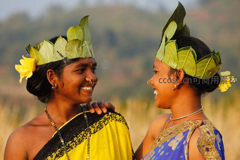 两位身着传统服饰的部落青年,头戴绿叶花冠,在温暖阳光下相视而笑,展现了纯真与文化的交融。