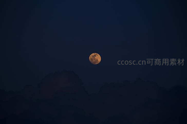 在深邃的夜空中,一轮橙黄色的满月从厚重的云层上方探出,散发着温暖而神秘的光芒。