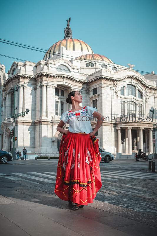 一位身着鲜艳红色传统长裙的女性舞者站在宏伟建筑前,姿态自信,背景是古典剧院,充满异域风情。