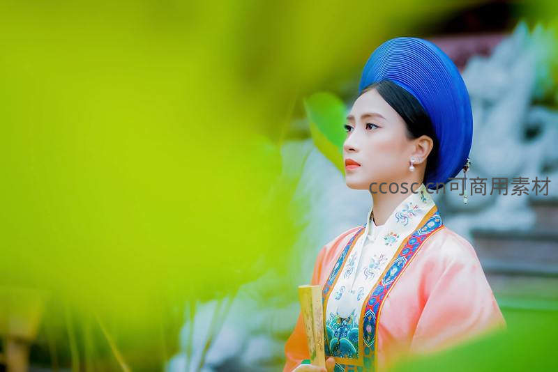 蓝帽古装女子庭院侧影