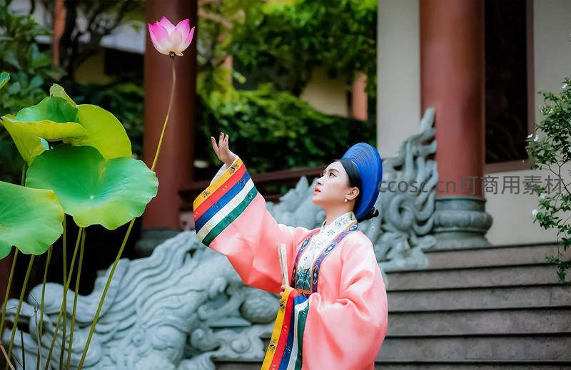 一位身着粉色古装、头戴蓝色帽子的女子,在古典庭院中仰首轻触一朵盛开的粉色荷花,动作温柔优雅,人与自然和谐相融,意境唯美。