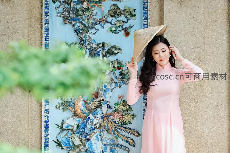 一袭淡粉色奥黛的女子头戴斗笠,轻触帽檐微笑回眸,身后是色彩斑斓的陶瓷花鸟壁画,绿植点缀,尽显东方女性柔美与艺术气息。