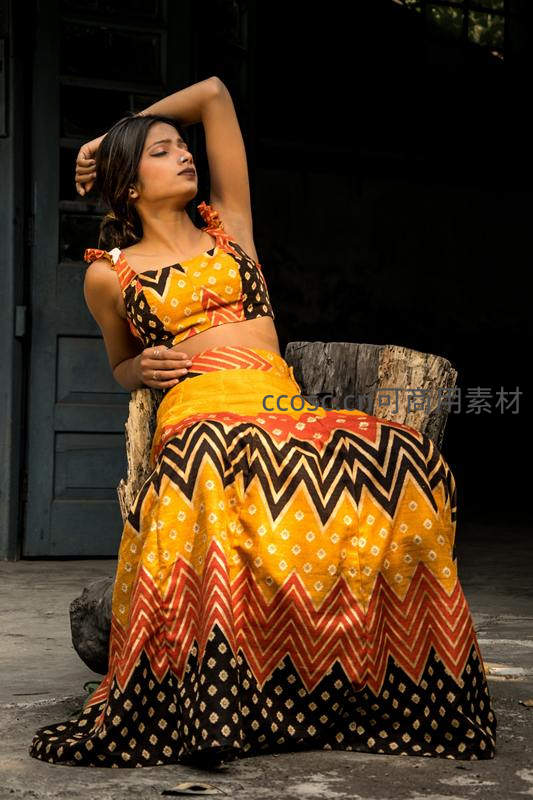 一位年轻女子身着鲜艳的黄黑几何图案传统服饰,优雅地坐在树桩上,背景是深色门廊,展现出浓郁的文化气息与宁静的美感。
