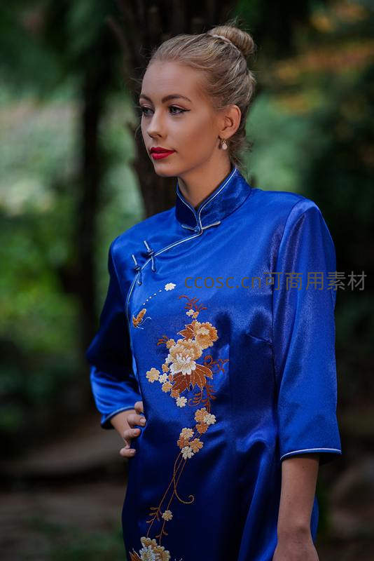 金发女子身着蓝色缎面刺绣旗袍,在绿意盎然的林间静立,精致妆容与传统服饰相得益彰,尽显东方女性的温婉与典雅。