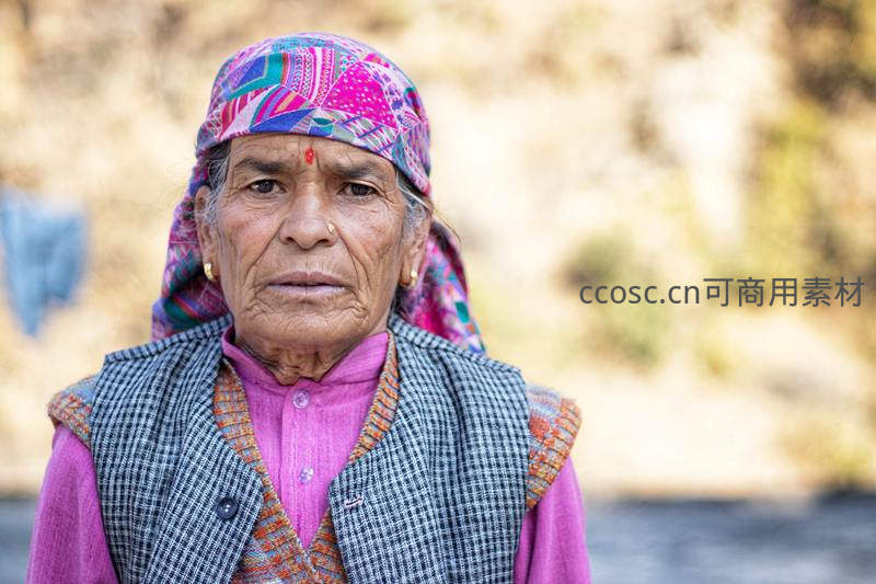 一位饱经风霜的老妇人头裹色彩斑斓的头巾,身穿格纹背心,眼神平静而深邃,记录下岁月沉淀下的坚韧与生活的本真面貌。