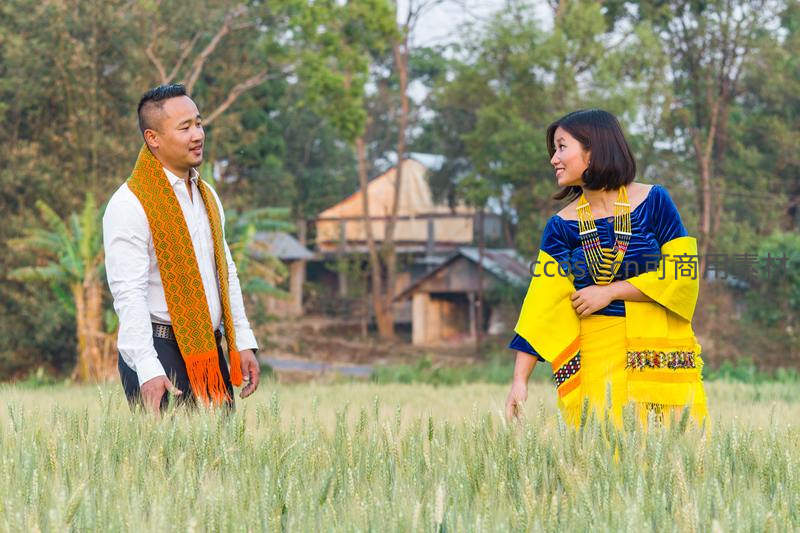 一对情侣身着色彩鲜明的传统服饰,站在青翠的麦田中深情对望,背景是乡间木屋,画面充满爱意、自然与浓郁的文化氛围。