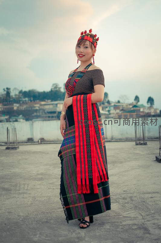 一位身着色彩鲜艳民族服饰的女子站在屋顶,身后是朦胧的城市轮廓,她的笑容与传统装扮形成现代与传统的对话。