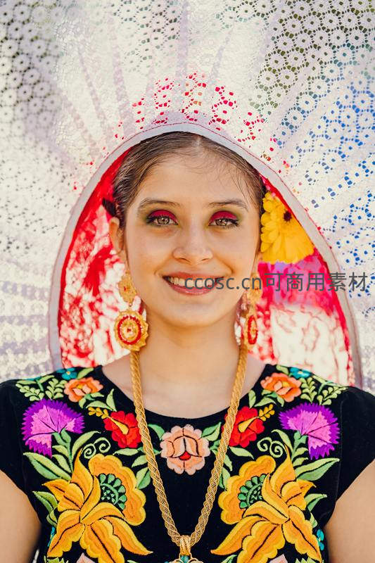 色彩斑斓刺绣服饰女子特写