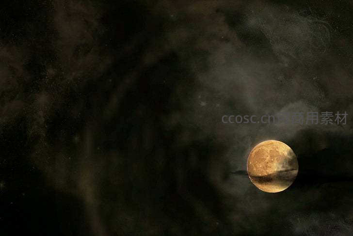 一轮金黄色的满月在翻滚的乌云中若隐若现,强烈的光影对比营造出戏剧性和神秘的氛围。