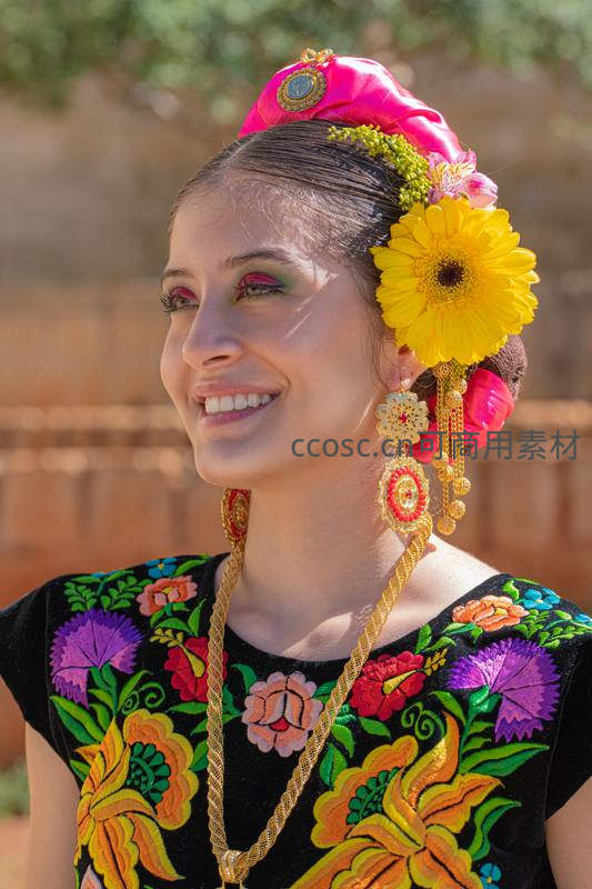 少女佩戴鲜艳花卉头饰与金色饰品,身穿色彩斑斓的刺绣上衣,笑容灿烂,阳光洒落面庞,展现出墨西哥传统节庆的活力与热情。