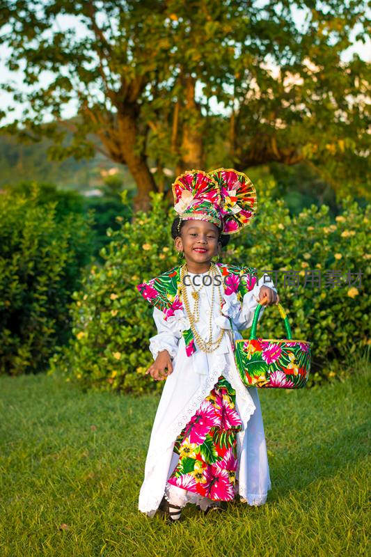 身穿鲜艳花卉图案民族服饰的小女孩,头戴同款大礼帽,手提彩色花篮,在阳光下的绿草坪上绽放灿烂笑容。