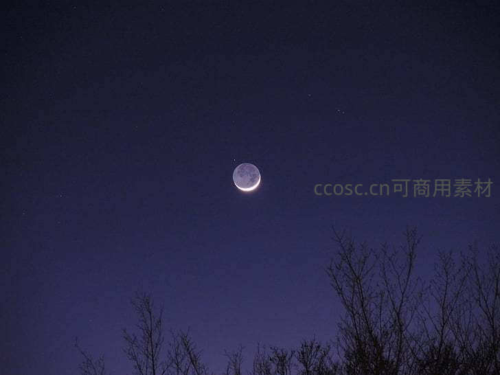 一弯新月高挂深蓝色夜空,下方是光秃的树枝剪影,营造出宁静而神秘的夜间氛围。
