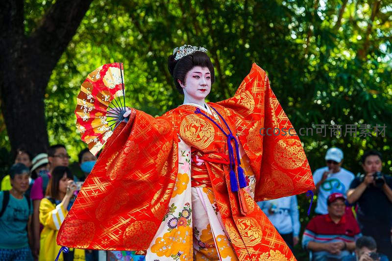 一位身着鲜艳橙色和服的艺伎在绿树成荫的户外优雅舞动,手持彩绘折扇,吸引众多游客驻足观赏,展现日本传统艺术的魅力与仪式感。
