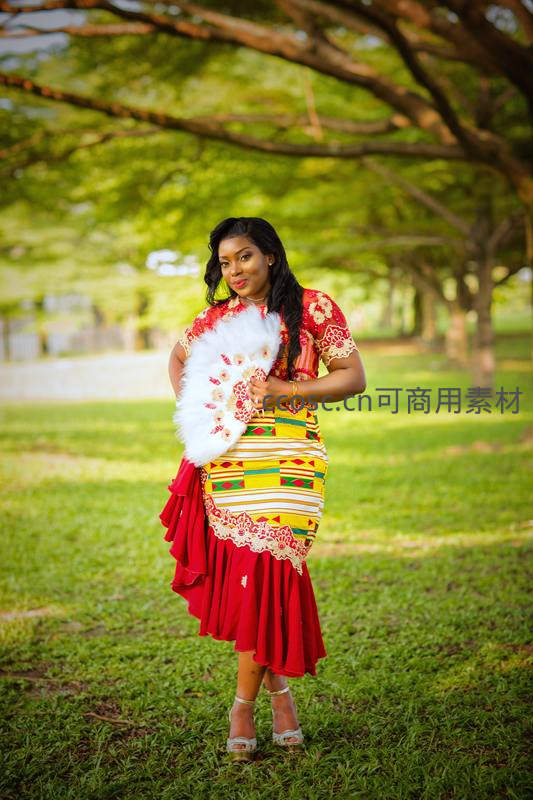 一位黑发女性在绿意盎然的公园中,身着色彩鲜艳的非洲传统服饰,手持羽毛扇,展现出自信与优雅,背景树木成荫,光影斑驳。
