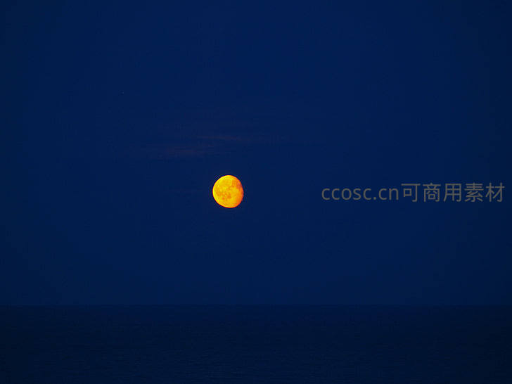 一轮橙红色的满月从深蓝色的海平面上升起,将温暖的光辉洒向无垠的海面与夜空。