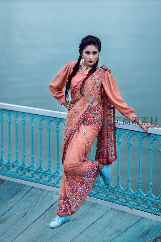 身着华丽纱丽的女子倚靠蓝色栏杆临水而立