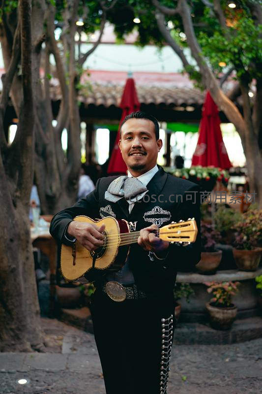 一位身着精致黑色马里亚奇礼服的墨西哥乐手,怀抱一把小型吉他,面带微笑注视镜头,背景是绿树与红色遮阳伞,洋溢着浓厚的拉丁音乐文化氛围。