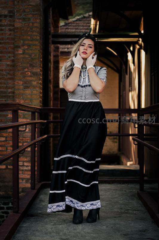 一位金发女子身着黑白相间的复古长裙与白色手套,站在红砖拱廊下的铁桥上,双手轻托脸颊,夕阳余晖洒落,营造出静谧优雅的怀旧氛围。